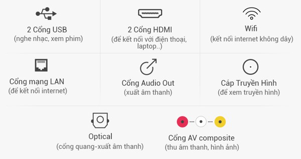 Trên tivi là các cổng kết nối USB, HDMI, Optical, AV Composite... để bạn dễ dàng kết nối tivi với các thiết bị khác.