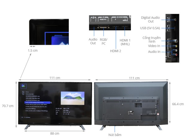 Kích thước màn hình 49 inch của tivi, có thể phù hợp với nhiều không gian từ phòng khách đến phòng ngủ, phòng làm việc...